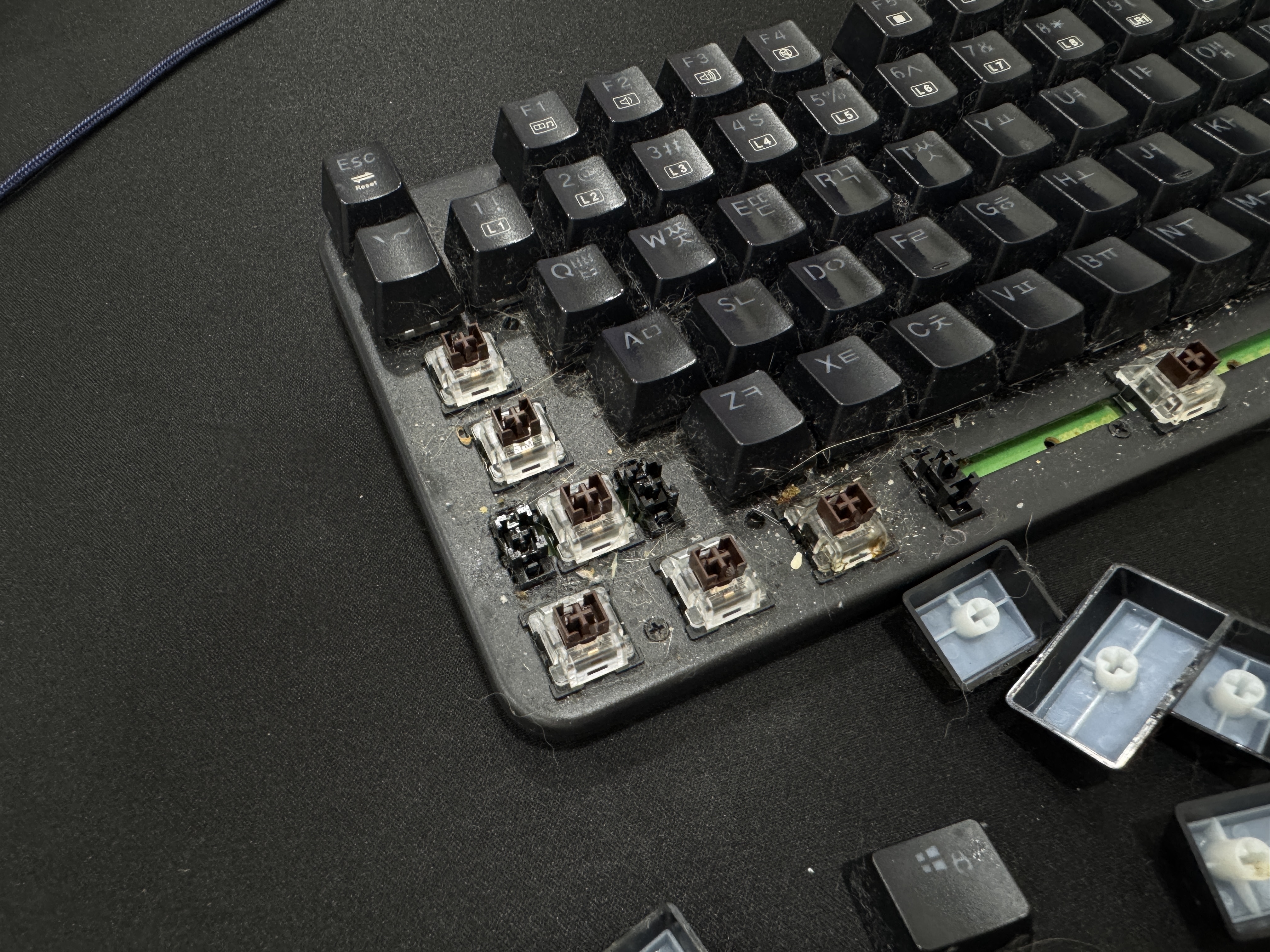 기계식 키보드는 키캡이 분리되니까요. 하나씩 떼어보는데, 그 안에 먼지며 과자 부스러기며…