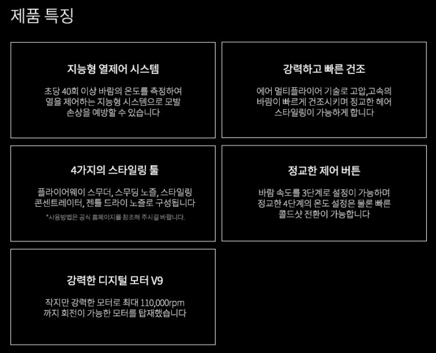 | 성능 | 빠른 건조 속도 (1600W 파워) | 바람 세기가 강해 예민하면 부담스러움 |