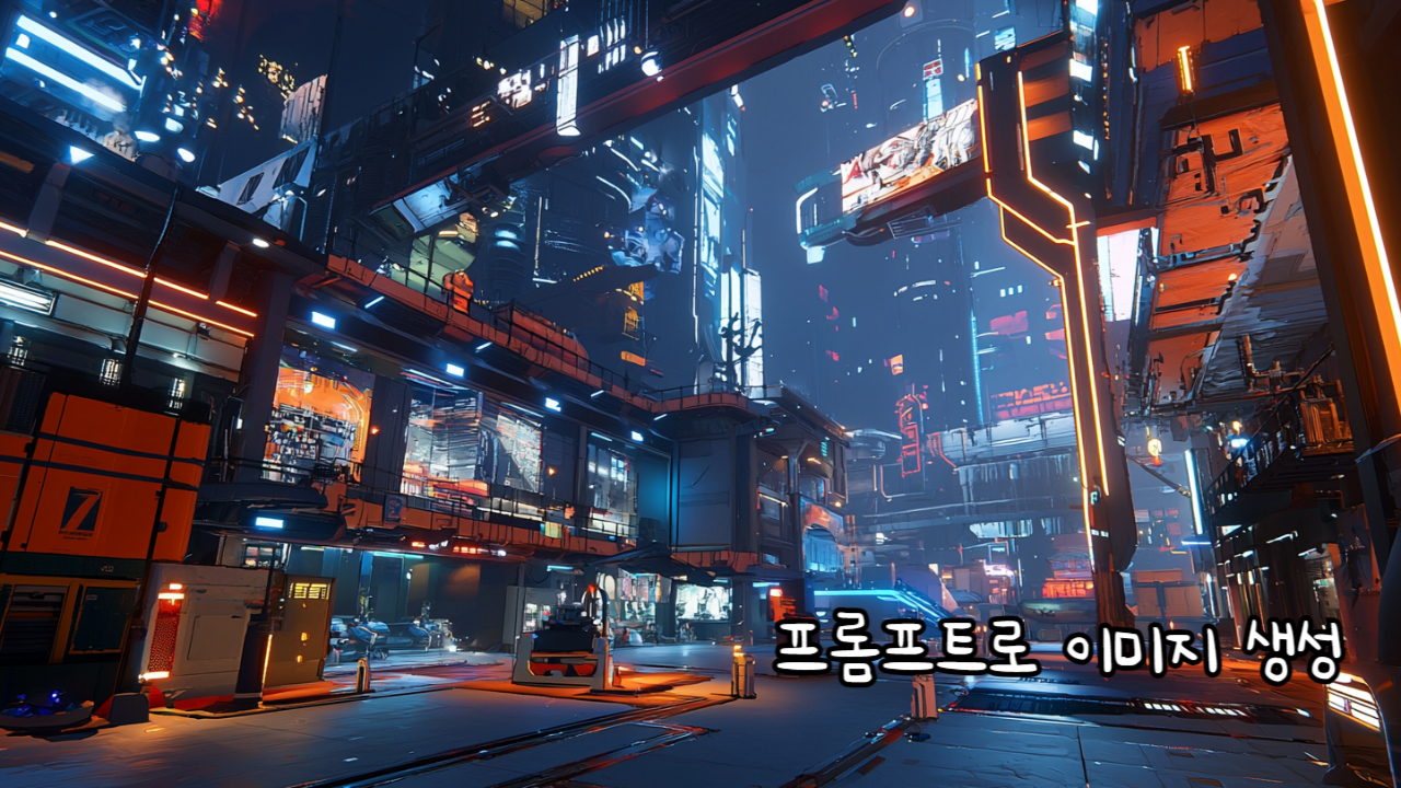 미래 도시의 네온사인이 빛나는 사이버펑크 스타일 이미지가 생성됩니다!