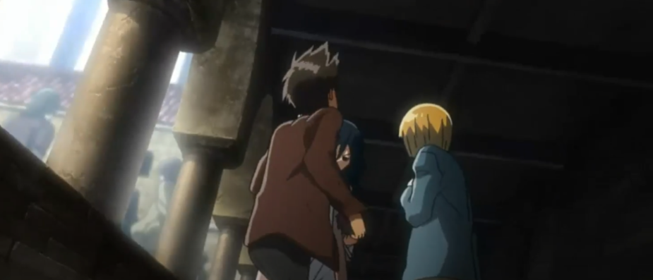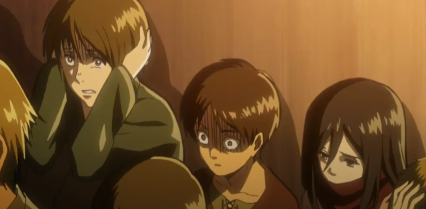 거인이 들어와서 정신이 나가버린 우리 주인공 3인방, 에렌과 미카사, 그리고 아르민.