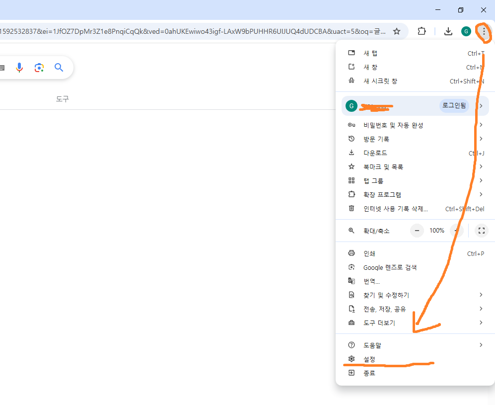 크롬 브라우저를 실행한 후 우측 상단 점 3개(메뉴 버튼) 를 클릭합니다.